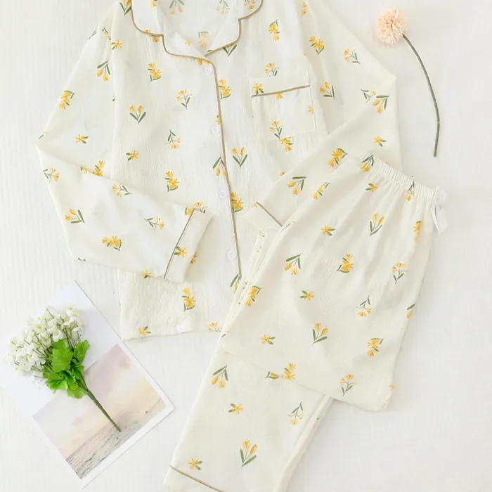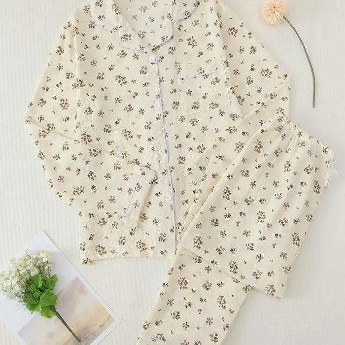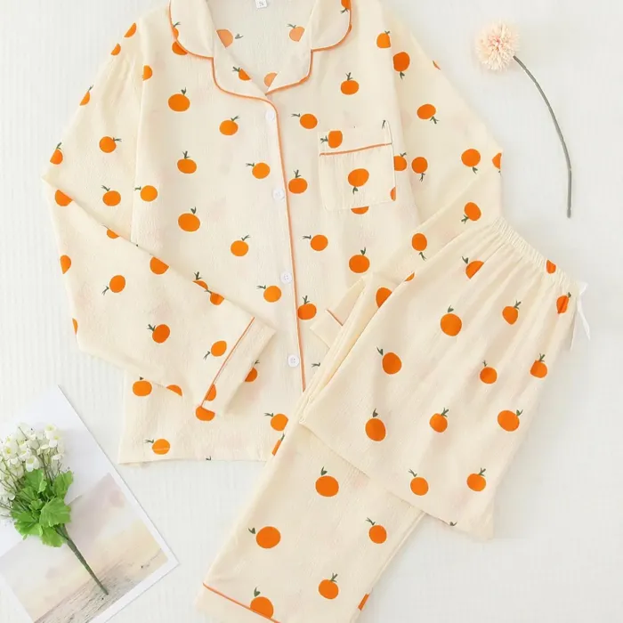 Women's Cartoon Print Button-Down Shirt Pajama Set